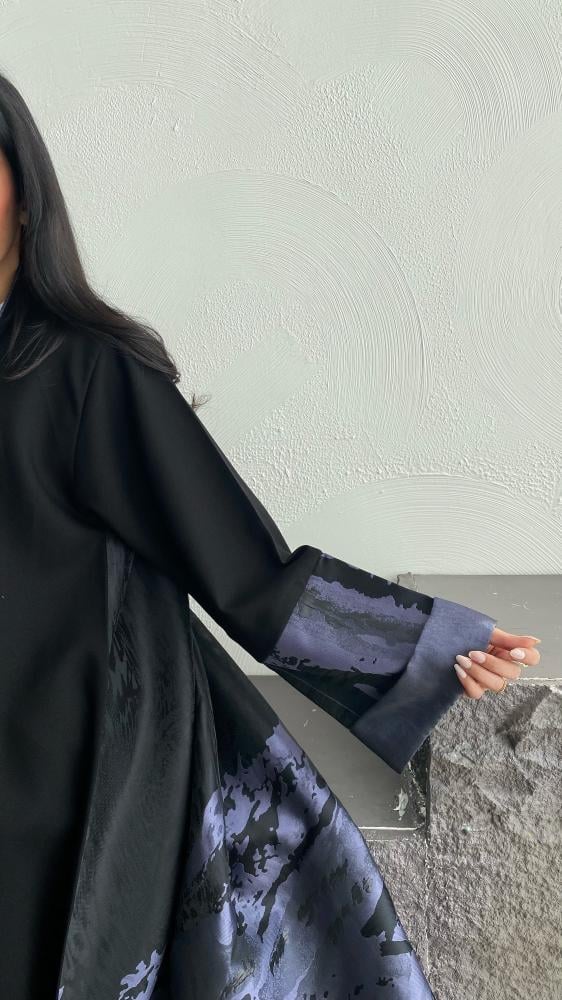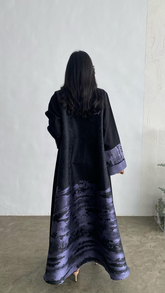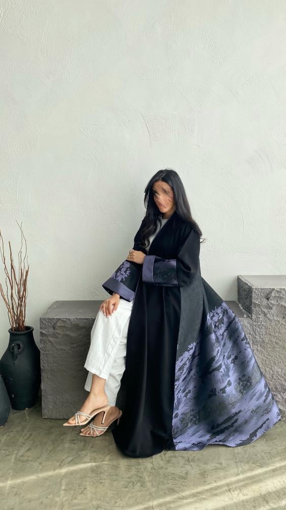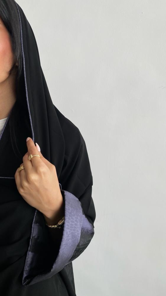 عباية كتان وتفته مشجر باللون الأسود وتفاصيل بنفسجية أنيقة مع تصميم نص كلوش