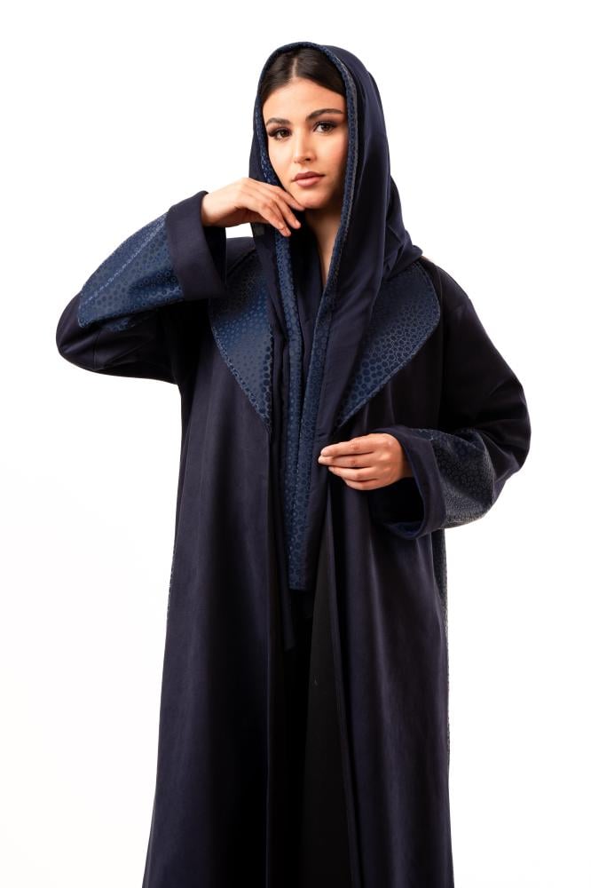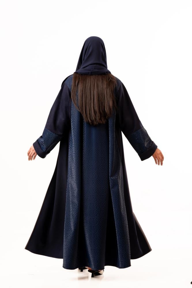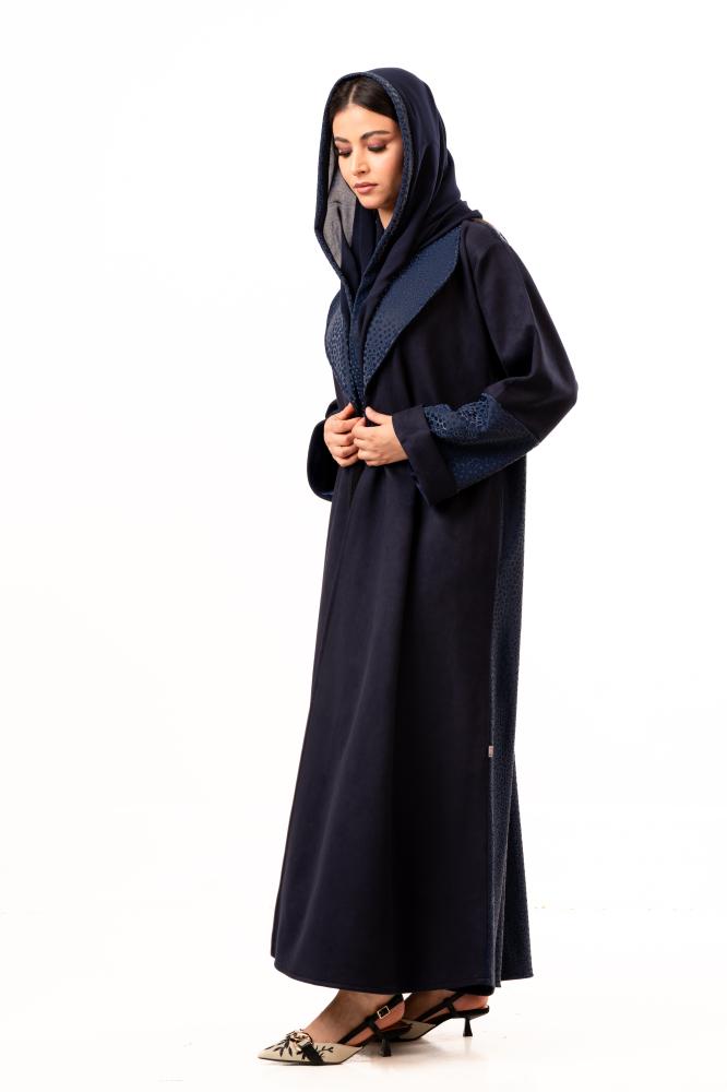 عباية شتوية شمواه باللون الكحلي بتفاصيل جلدية - تصميم نص كلوش