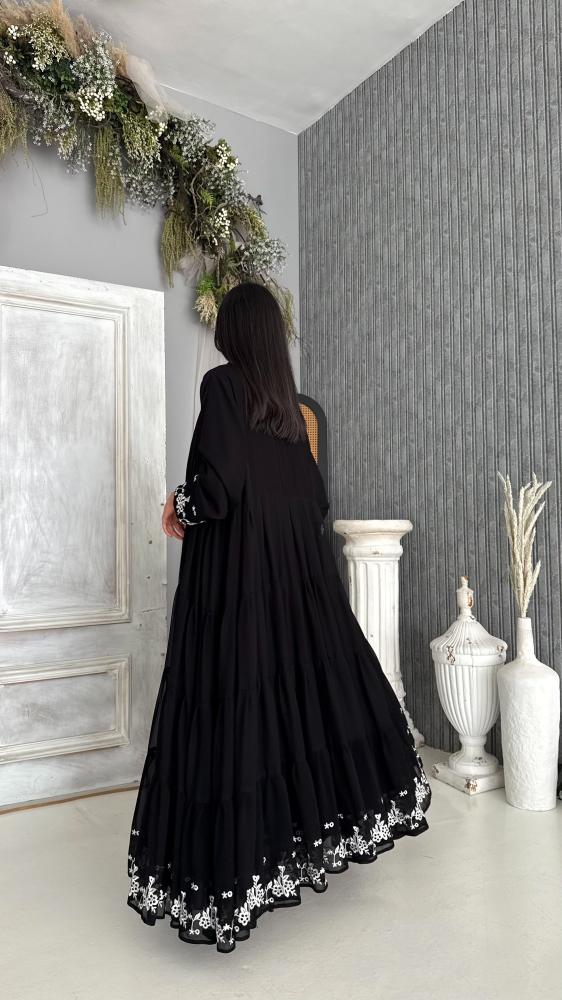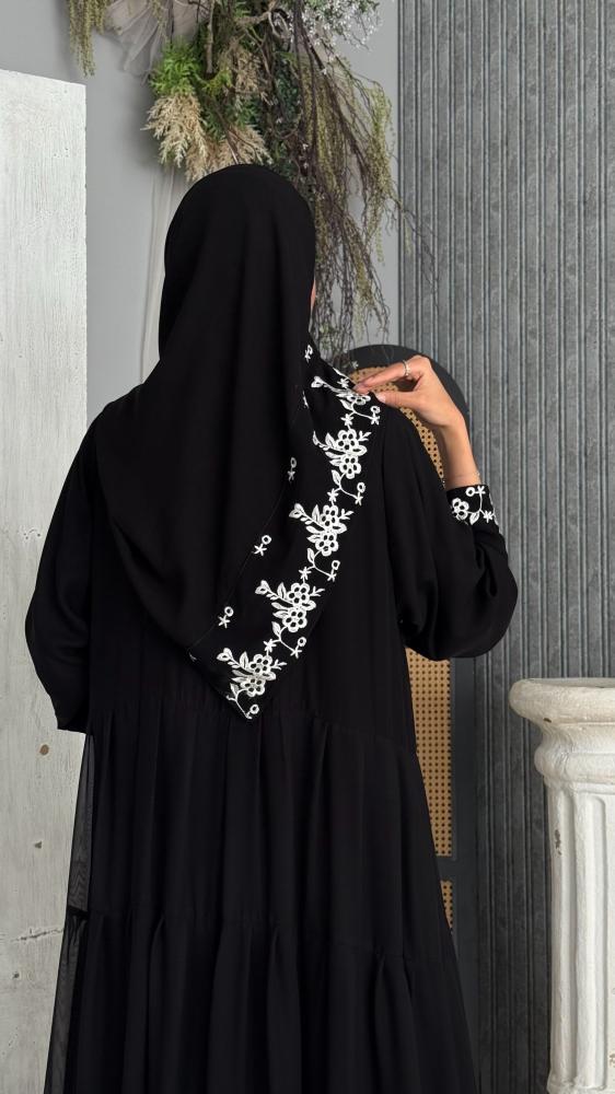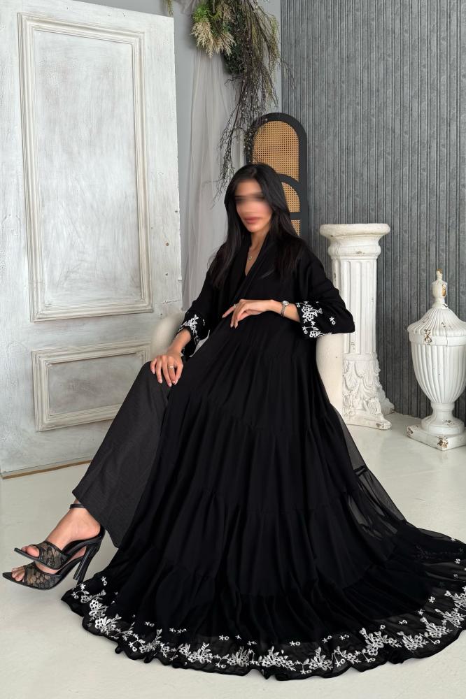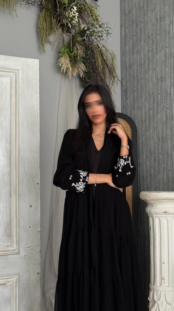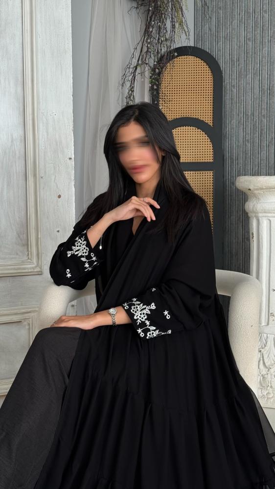 عباية تُجسد الفخامة في كل تفاصيلها: شيفون مبطن يعطيكِ تغطية وراحة، وتطريز دقيق يزين الأطراف ليُكمل إطلالتكِ بأنوثة راقية. قصة كلوش تُضفي انسيابية في الحركة وتبرز طلتكِ بكل رقي.