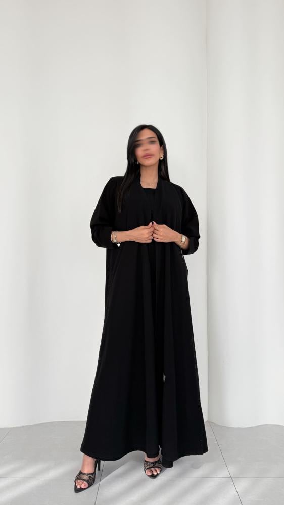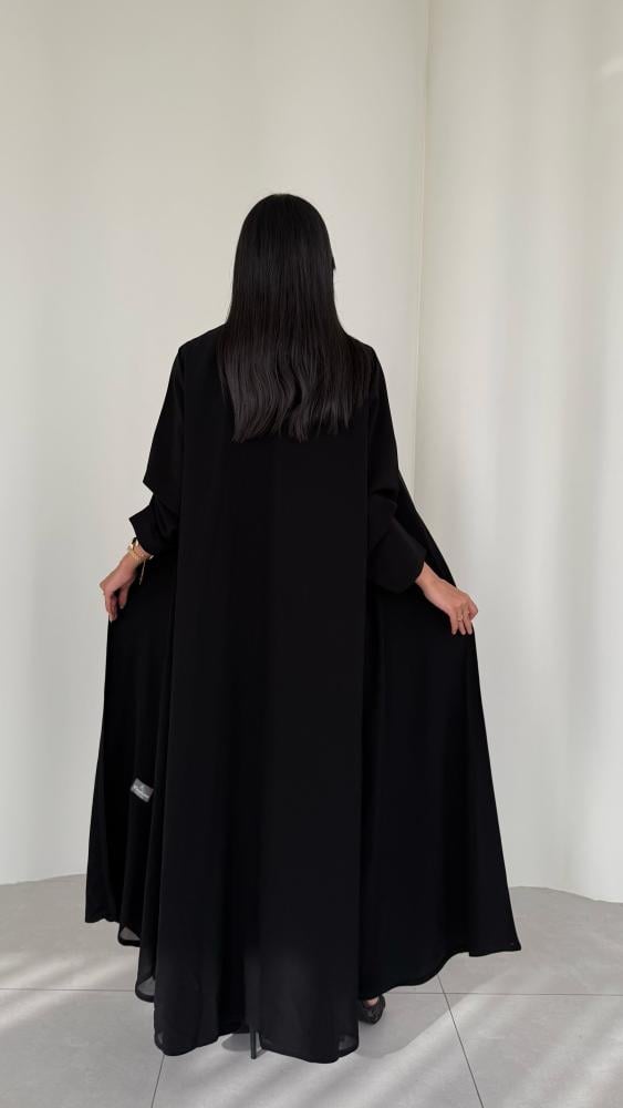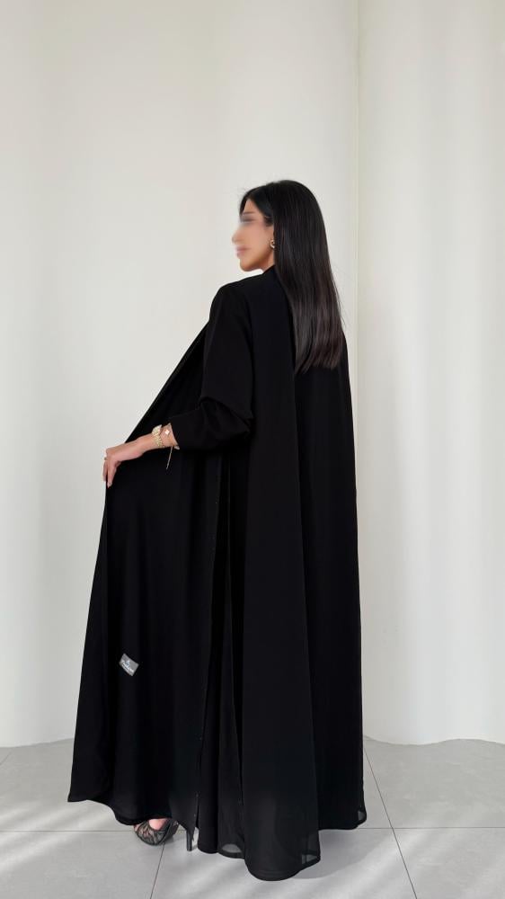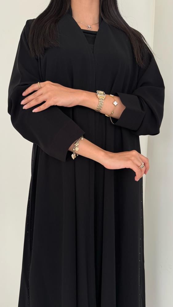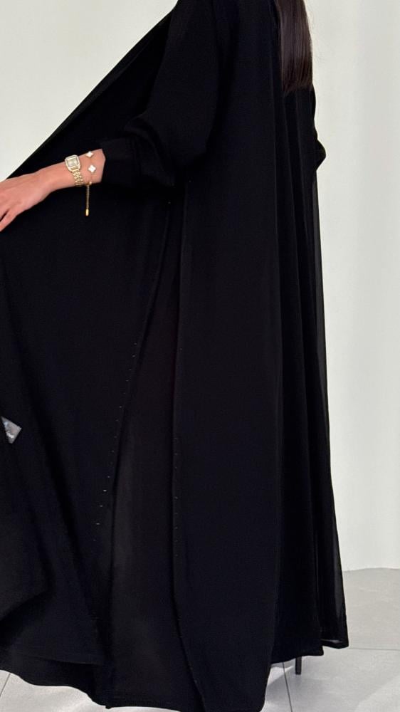 أضيفي لمسة من الفخامة لإطلالتك مع هذه العباية الأنيقة بالقصة النص كلوش، المصنوعة من قماش الشيفون الفاخر والمبطنة بقماش بلاك بيري لراحة وأناقة تدوم طوال اليوم. تزيّن الجوانب بكريستال أسود فاخر يمنح العباية بريقاً راقياً ولمعاناً ناعماً، مما يجعلها خياراً مثالياً للمناسبات الخاصة والسهرات الراقية. تصميمها يجمع بين الانسيابية والفخامة ليمنحك حضوراً مميزاً.
